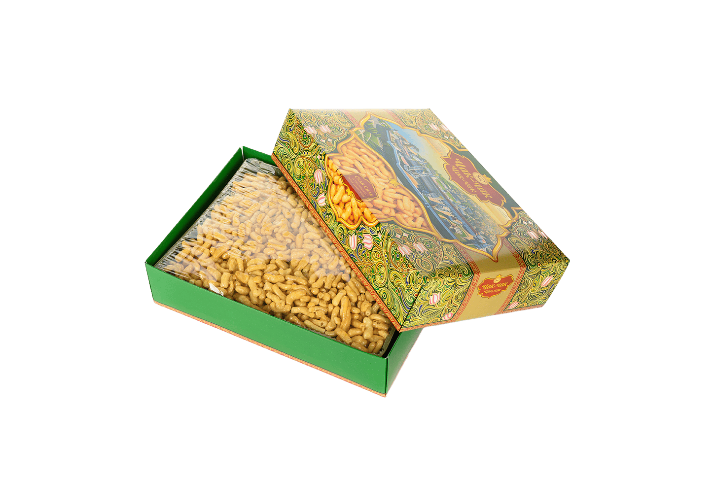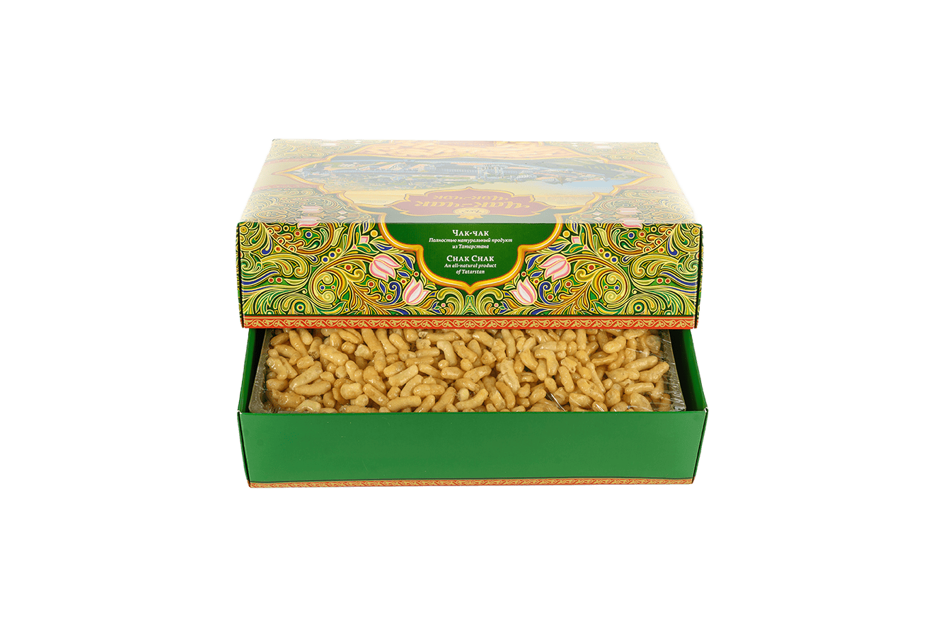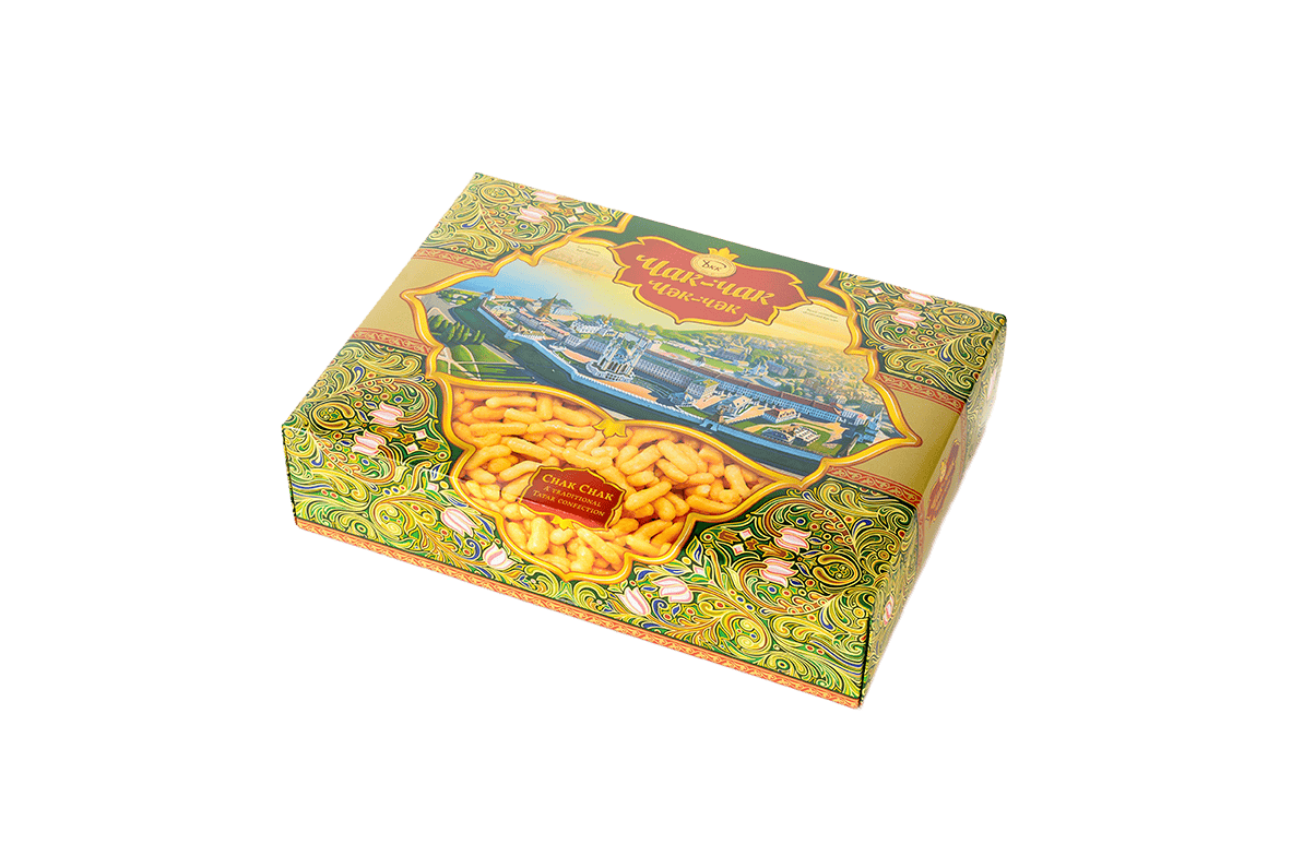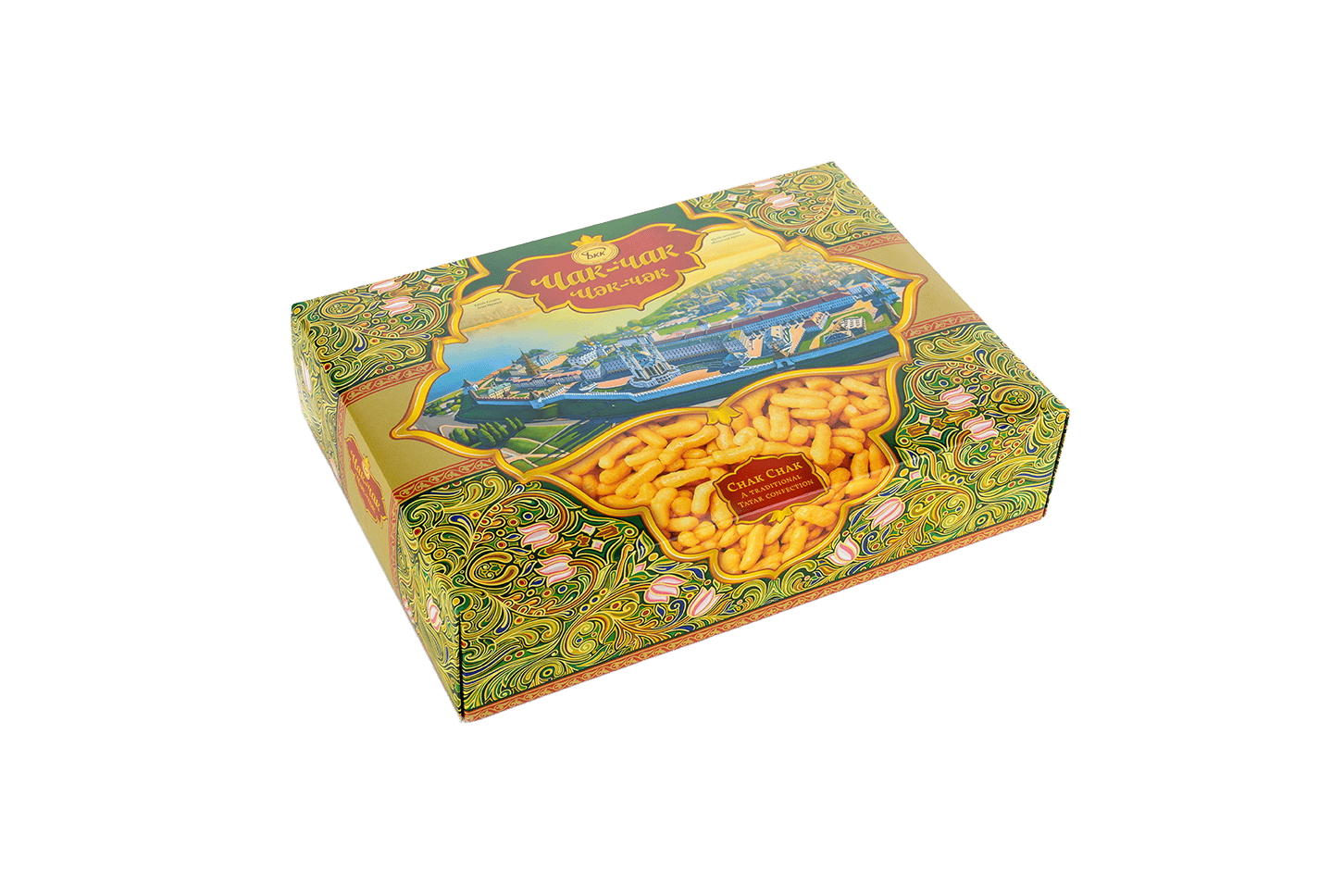 Национальное кондитерское изделие «Чак-Чак» - это сладкий десерт из обжаренных во фритюре кусочков теста, пропитанных медовым сиропом. Традиционное блюдо «Чак-Чак» станет отличным сувениром и подарком к столу. Прочная коробка стилизована татарским орнаментом и фотографией Казанского Кремля.