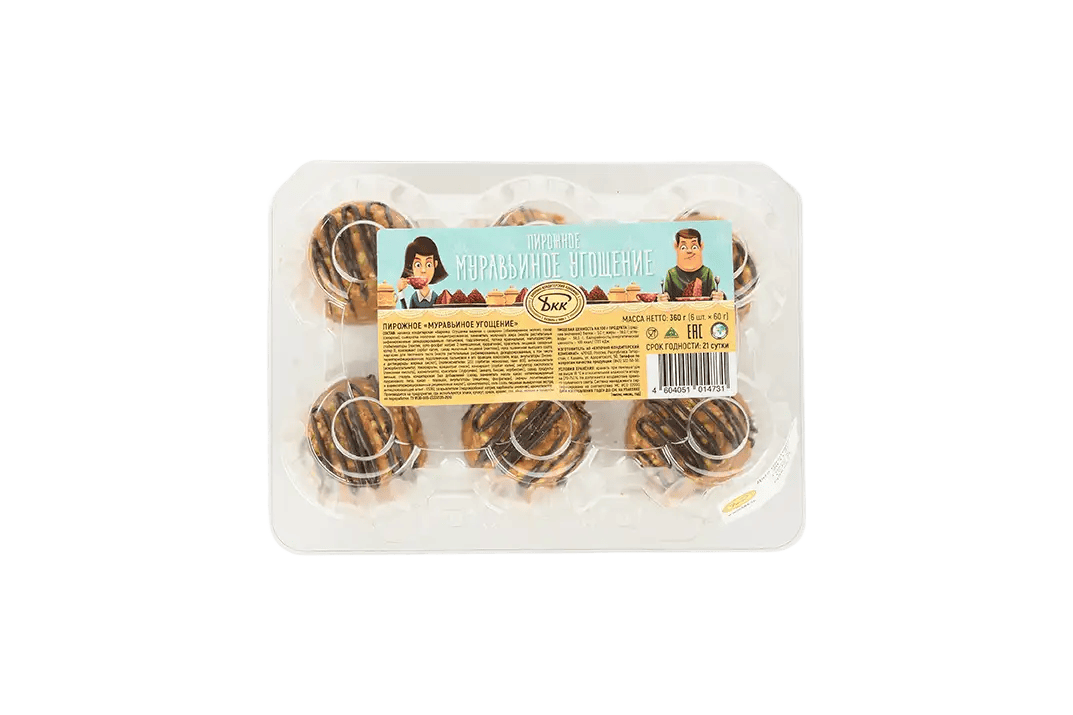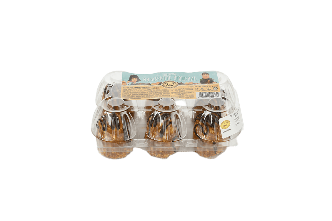 Пирожное «Муравьиное угощение» – для многих это вкус детства и до сих пор самое домашнее лакомство. Это плотное песочное тесто, измельченное в мелкие кусочки и подпеченное в духовке, выложенное в виде небольших горок с кремом из вареной сгущенки. Сверху пирожное полито тонкой сеткой из шоколадной глазури. Пальчики оближешь! В упаковке 6 пирожных - хватит на всю семью, или себе одному, пока никто не видит) ).